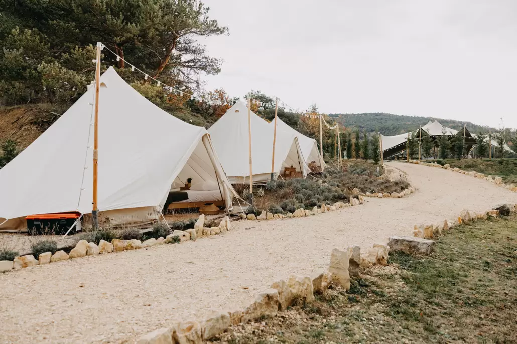 • 2 chalets en bois abritent chacun une salle de bain : douche, lavabo et WC